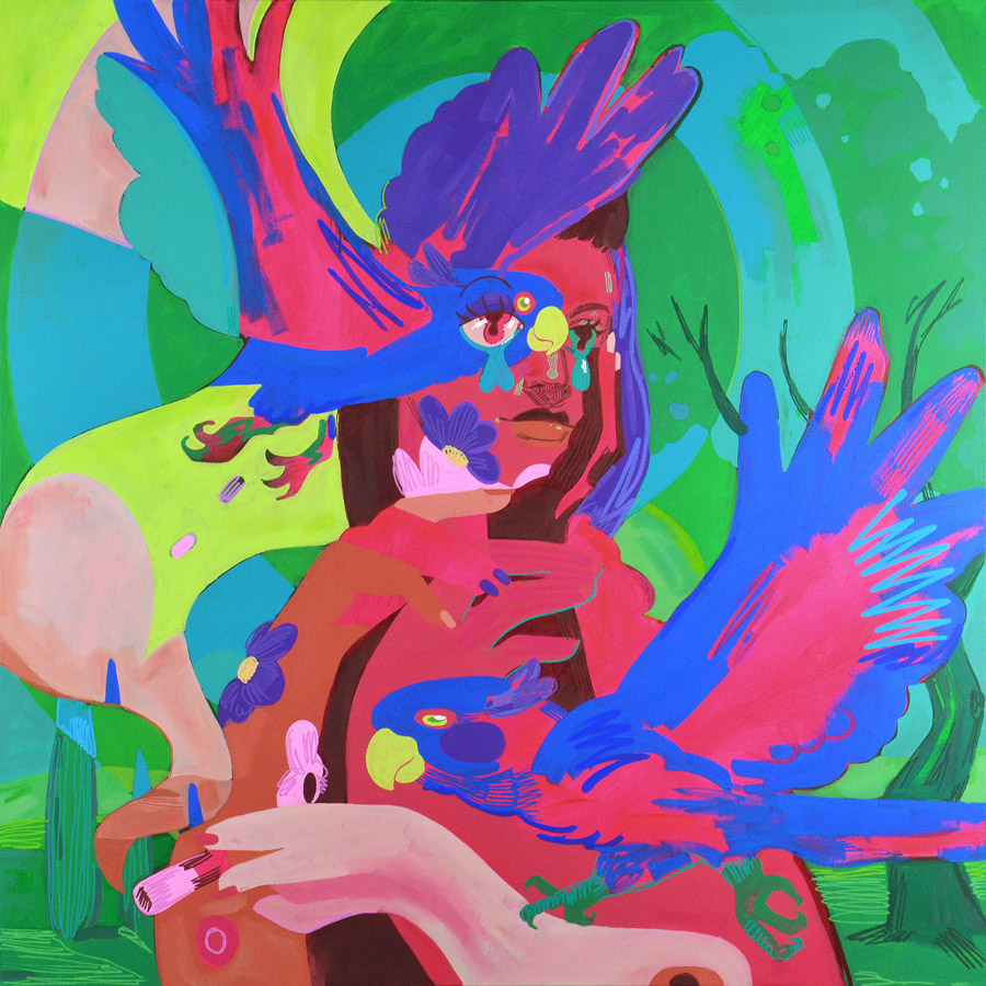 Dall'altra parte, le opere di Fiumicelli, caratterizzate da forme decise e colori vibranti, trasmettono un senso di vitalità e comunicazione. Artista non udente, parte della sua ricerca verte proprio sulla necessità di comunicazione, espressa attraverso l'inserimento di parole comunicate attraverso la lingua dei segni, utilizzando le mani delle sue muse.